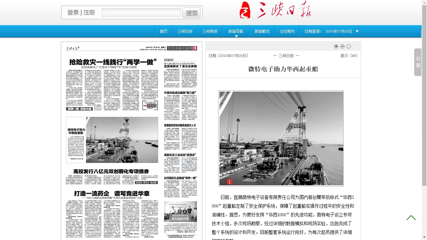 7月26日,三峽日報A9版刊登了題為《微特電子助力華西起重船》的圖文消息。文中介紹了我司為國內(nèi)首創(chuàng)臂架后移式“華西1000”起重船定制了安全保護系統(tǒng)的基本情況。
