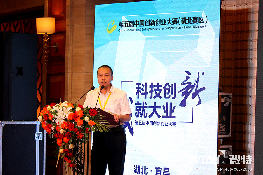 上圖為決賽現(xiàn)場,微特市場總監(jiān)李彬在臺上向評委與創(chuàng)業(yè)者介紹微特電子及“智慧吊裝生態(tài)系統(tǒng)”的創(chuàng)業(yè)項目