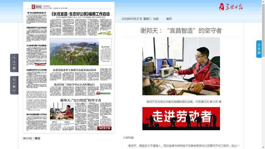 2018年4月17日,三峽日報(bào)與三峽宜昌網(wǎng)同步發(fā)布了題為“走進(jìn)勞動(dòng)者|謝邦天:“宜昌智造”的堅(jiān)守者”的專訪文章,贊揚(yáng)了微特研發(fā)工程師堅(jiān)守崗位,默默耕耘,為“宜昌智造”貢獻(xiàn)力量。