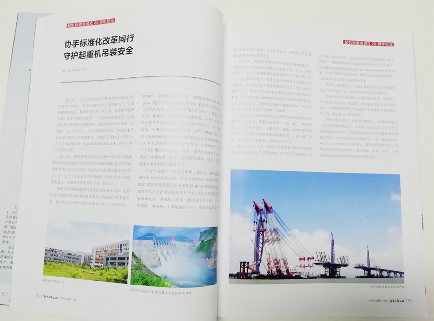 近期,署名微特技術(shù)有限公司的文章《協(xié)手標準化改革同行 守護起重機吊裝安全》在中國科技核心期刊《起重運輸機械》雜志“起機標委會成立20周年”專題報道中發(fā)表。