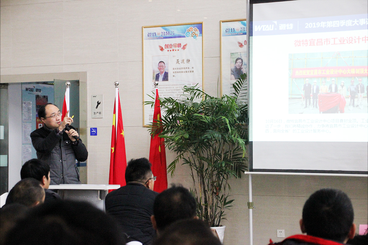 會議中,公司總經(jīng)理高鈺敏帶領與會同事一起回顧了19年第四季度的重要事件。在第四季度中,微特各部門全部順利完成19年全年累積銷售任務,截止12月31日,公司整體大幅超額完成全年任務;聶董參加湖北省委經(jīng)濟工作會議及省政協(xié)專題會并宣講發(fā)言;微特被國家工信部認定為國家級工業(yè)設計企業(yè)并參加第三屆中國工業(yè)設計展覽會;微特宜昌市工業(yè)設計中心項目喜封金頂;10月份,微特參加19年印尼海事展;聶董獲聘為三峽大學碩士生導師;微特受邀參加中電建協(xié)施工機械專業(yè)委員會年會,參加中國機械工程學會物流工程分會六屆二次理事會,參加印度國際工程機械與技術(shù)展覽會等多項重要會議。