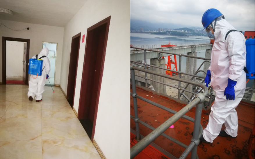 ▲上圖為施工前對生活營地和施工現(xiàn)場設(shè)備進行消毒。