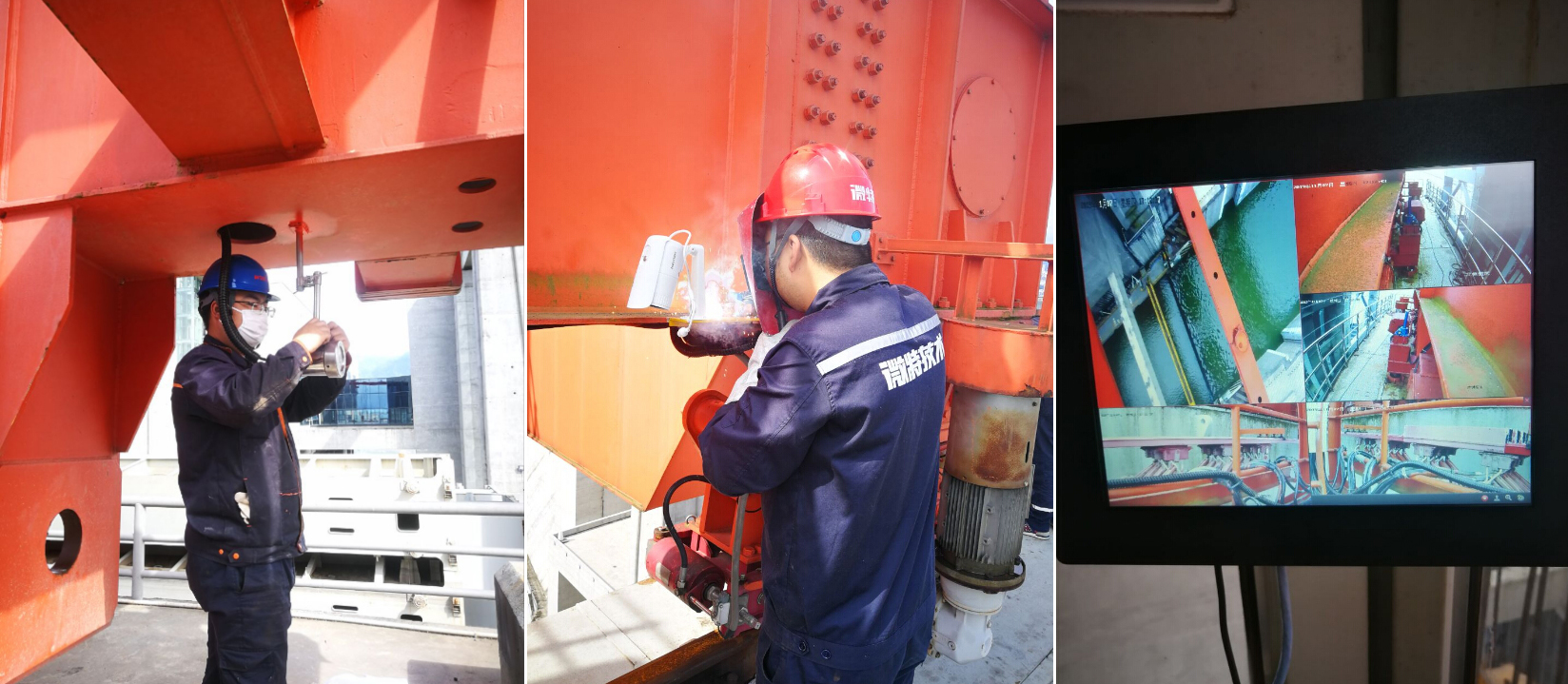 現(xiàn)場復(fù)工后,微特技術(shù)項目組正式投入井然有序的施工中,本項目施工主要包括上閘首500T橋機和300T橋機、下閘首160T橋機電纜卷筒控制方式、抓梁穿、退銷應(yīng)急回路、應(yīng)急泵站一體化改造、增加視頻圖像監(jiān)控、橋機潤滑系統(tǒng)改造、橋機滑觸線更換、軌道檢測等。