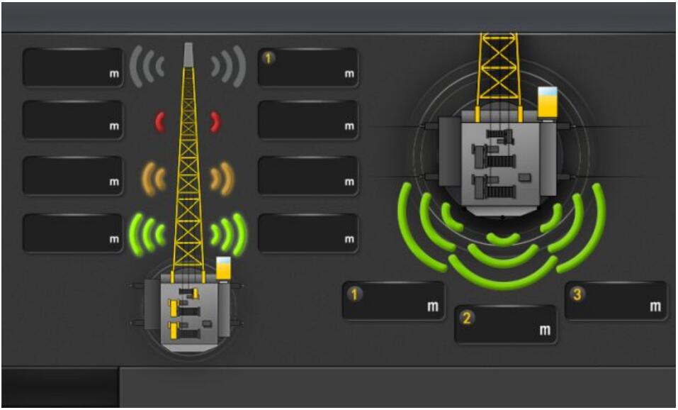 區(qū)域主動(dòng)防碰撞系統(tǒng): 通過(guò)雷達(dá)主動(dòng)監(jiān)測(cè)起重機(jī)易碰運(yùn)動(dòng)部位路徑,探測(cè)區(qū)域空間內(nèi)是否有障礙物,以此來(lái)避免吊機(jī)與吊機(jī)間,回轉(zhuǎn)部位與其它物體、臂架與周邊物體之間的區(qū)域空間是否安全,在安全區(qū)被入侵時(shí)發(fā)出聲、光報(bào)警,甚至給出止??刂菩盘?hào),實(shí)現(xiàn)主動(dòng)防碰撞監(jiān)測(cè)保障設(shè)備安全。