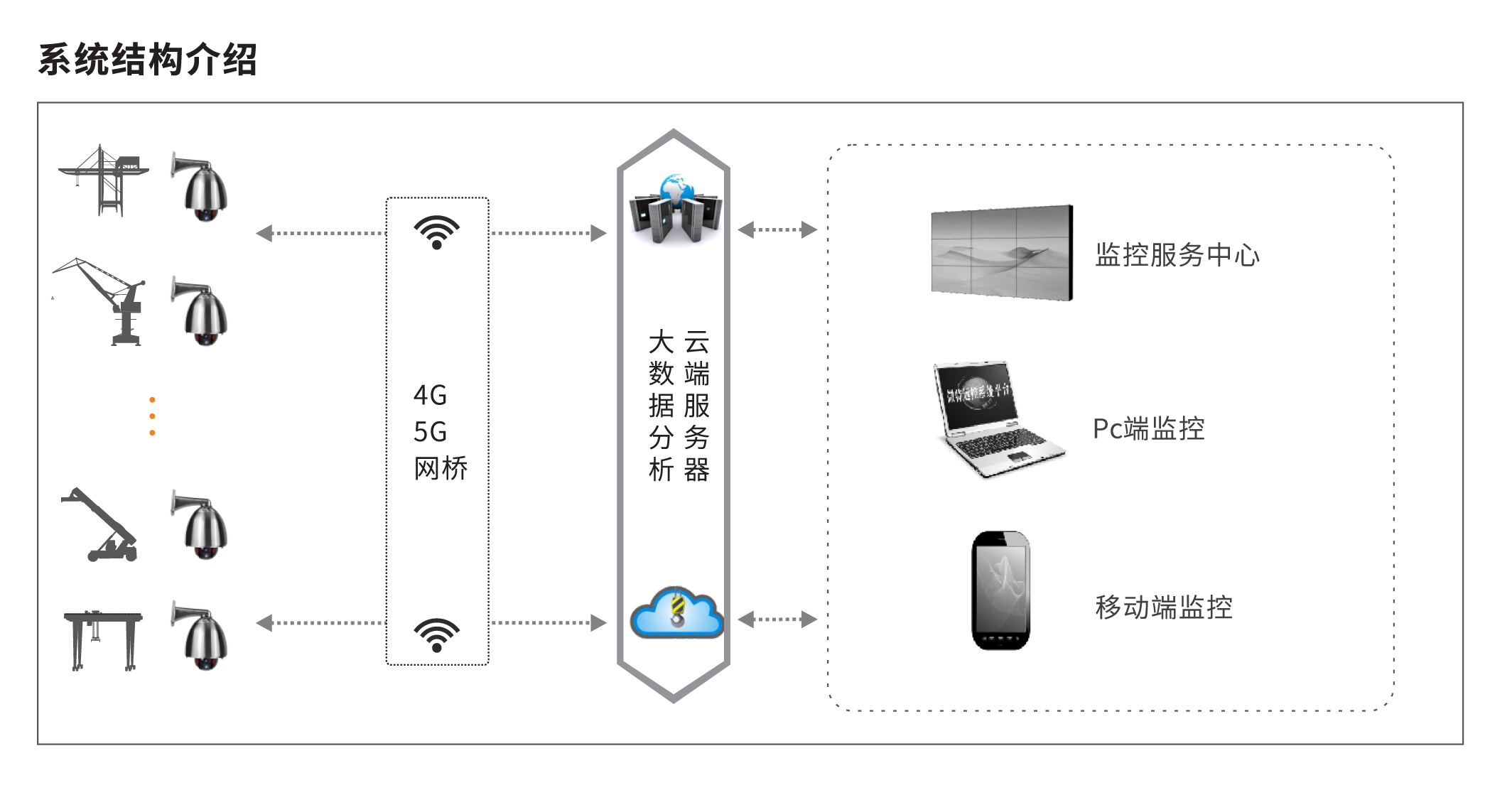 港口無線覆蓋方案:對于固定位置吊機可以采用點對點或多點的定向傳輸布局方式覆蓋,對于車載移動的設備可 以在吊車移動區(qū)域全向覆蓋在橋接定向傳輸的布局方式。