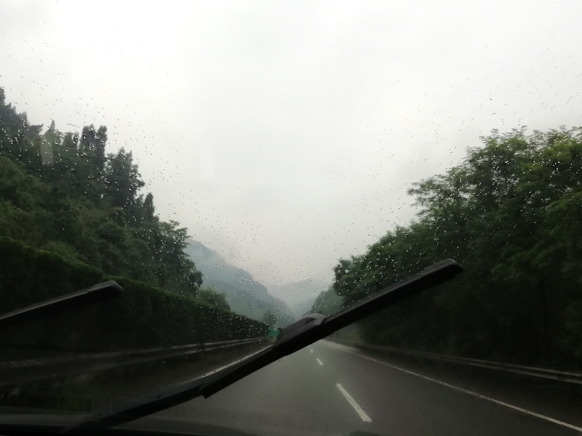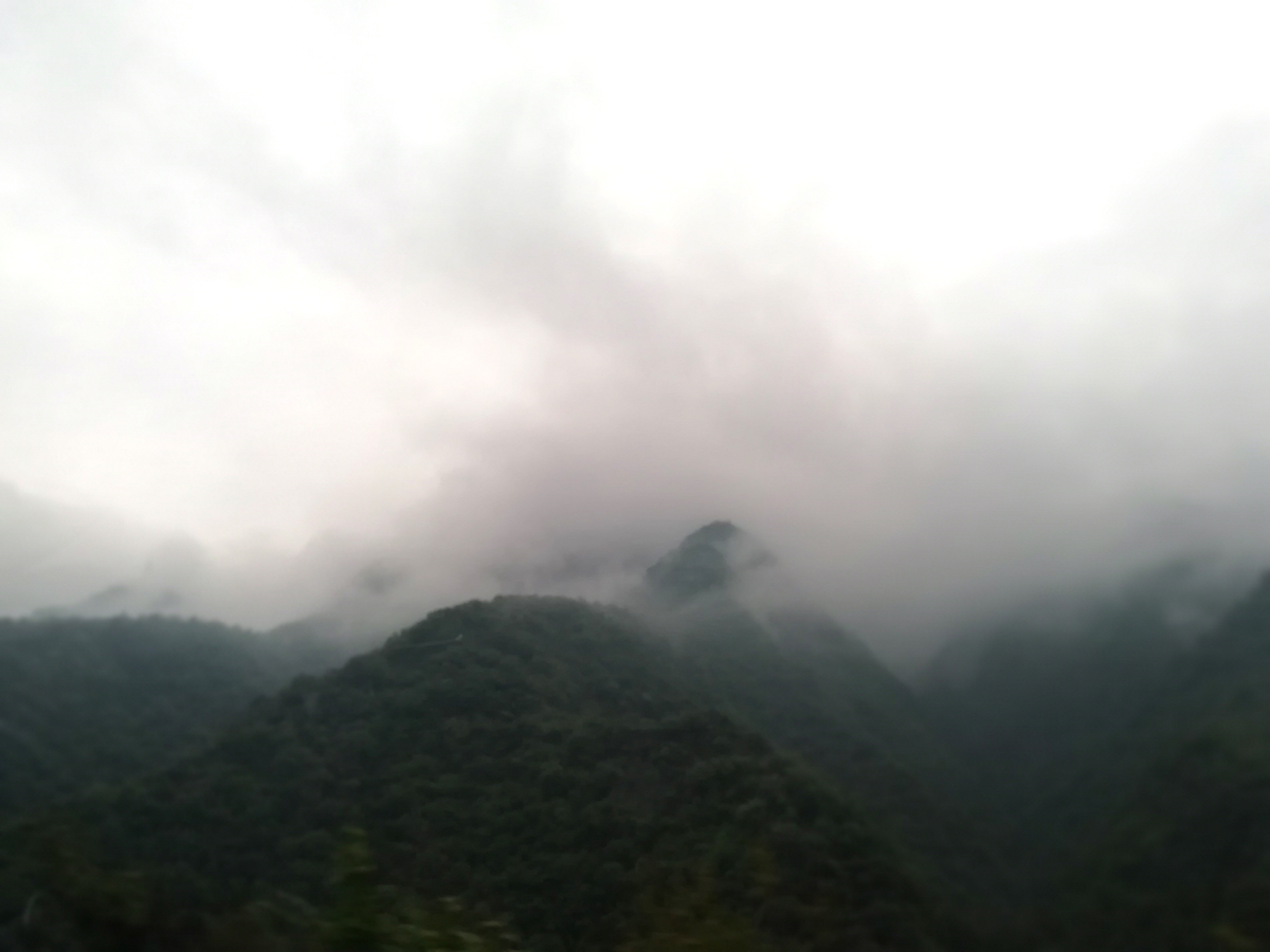 山上的路,和三年前一樣,一路上有大卡車在運送著泥土或石子。有兩處工地,在做塌方修復(fù)施工。雨慢慢也下大了,逐漸的山里霧氣彌漫,能見度不足100米,車速越來越慢了。